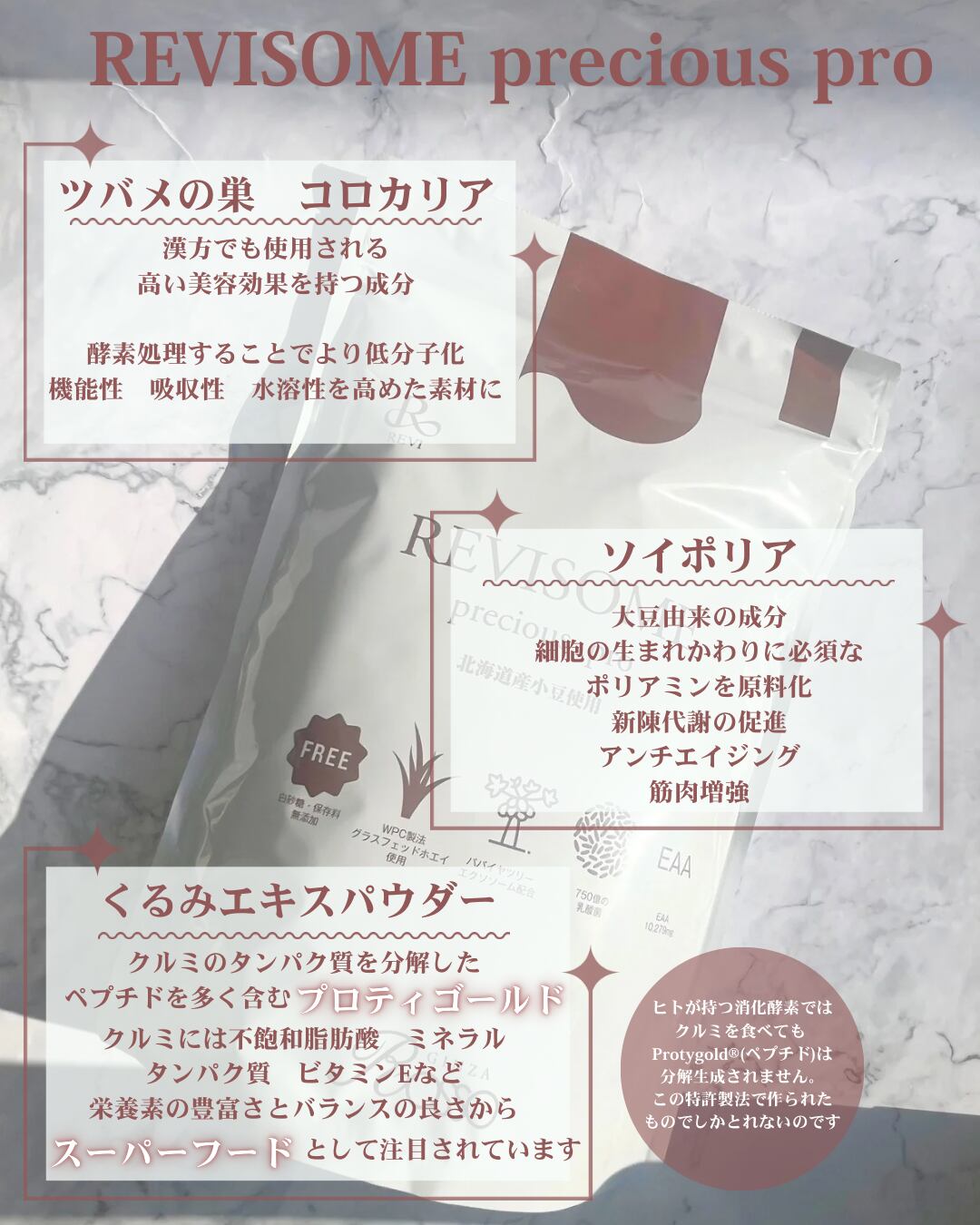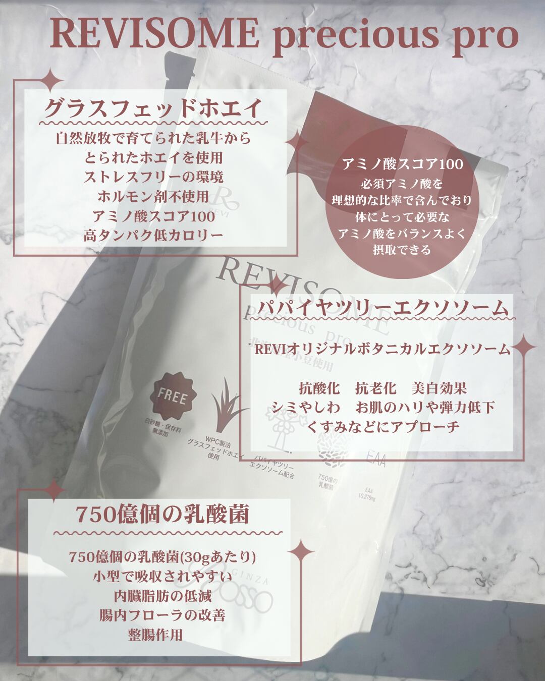 グラスフェッドホエイ・パパイヤツリーエクソソーム・EAA・750億個の乳酸菌・コロカリア(燕の巣)・ソイポリアに加えて