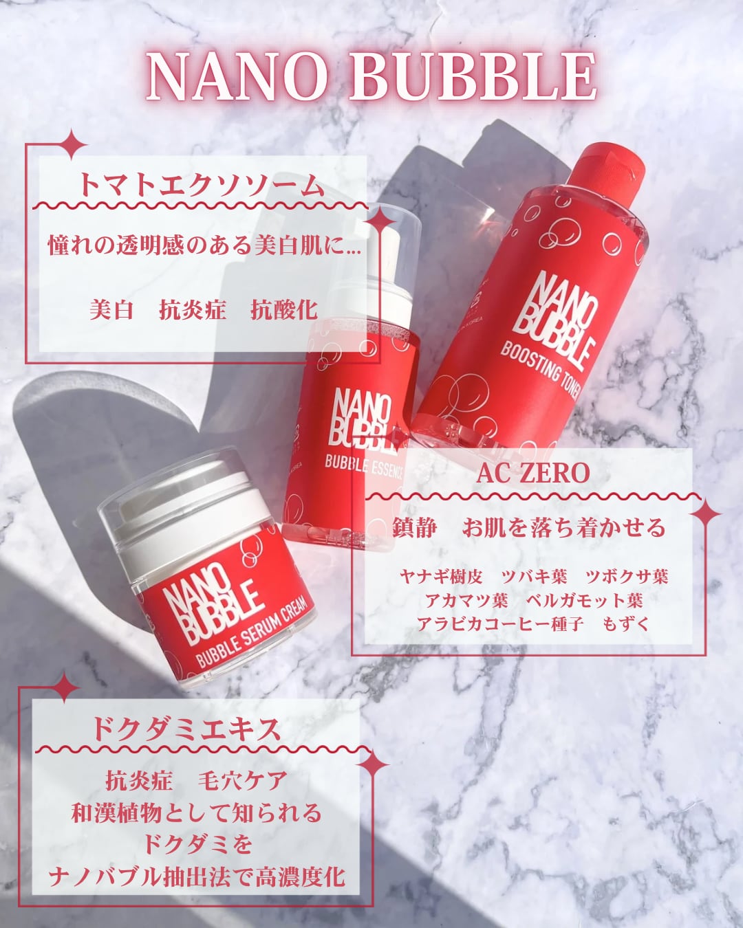 このシリーズは、ナノバブルの浸透力 × 有効成分(美白・抗炎症・抗酸化)を組み合わせた