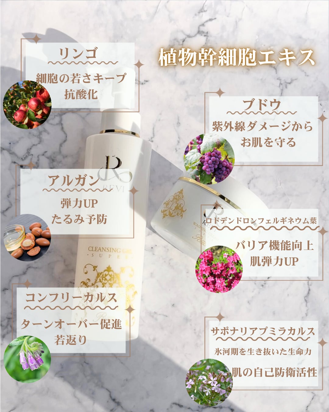 REVIでお馴染みのリンゴ、ブドウ、アルガン幹細胞エキスに加え、